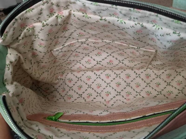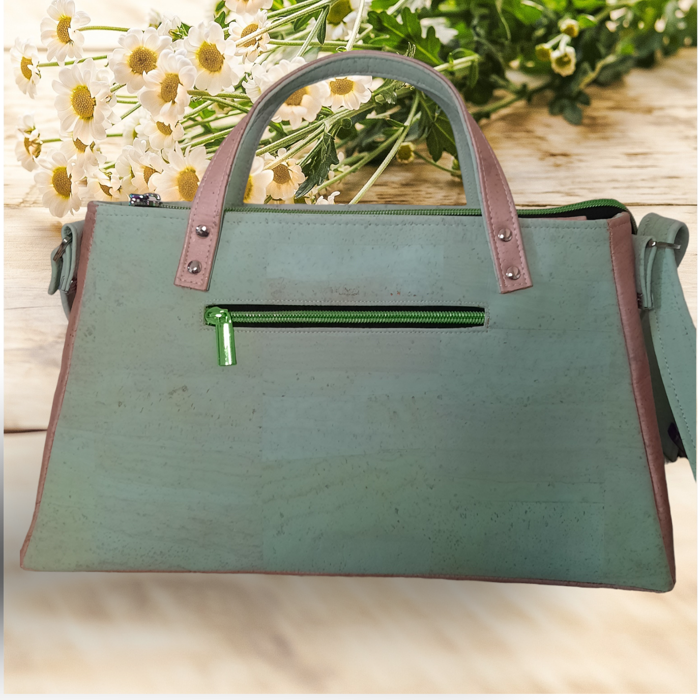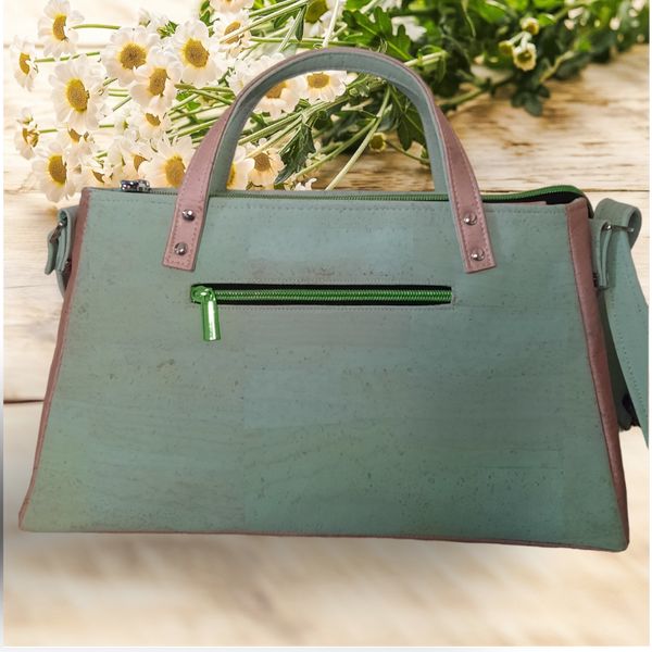 Sac trapèze vert et rose en liège. C'est une création personnelle. Il n'en existe qu'un seul et unique exemplaire.