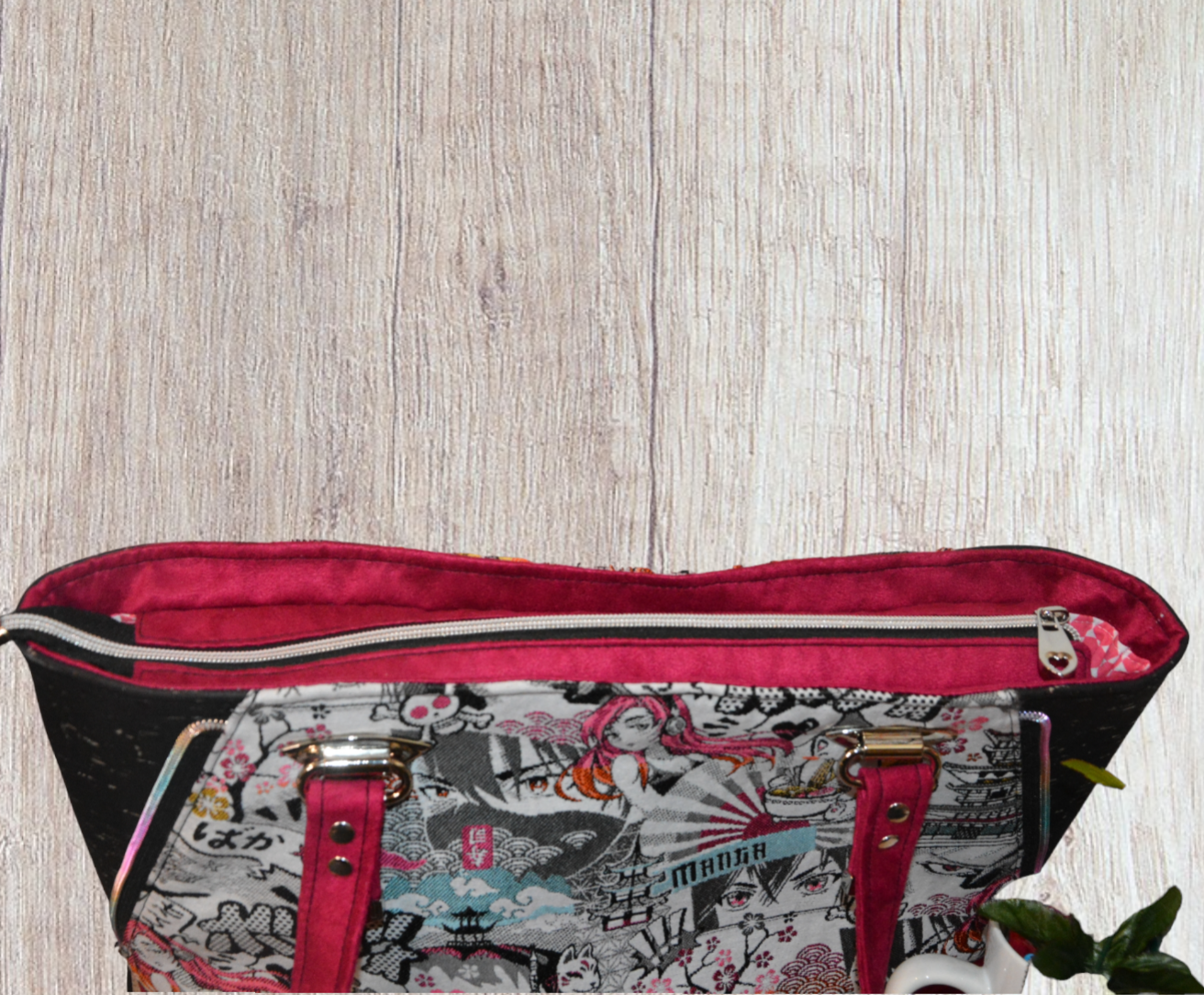 Très grande capacité pour ce sac cabas tissu jacquard "manga", bas du sac et anses en suédine bordeaux, cotés et fond en liège noir argent. L'intérieur est en tissu coton issu du upcycling, il est doté d'une poche plaquée tissu "manga" et d'une grande poche zippée. les zips multicolores sur les côtés peuvent se fermer mais servent surtout de décoration, le fond est renforcé par 5 pieds métalliques. Le sac se ferme grâce à un zip argenté.