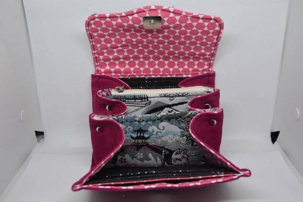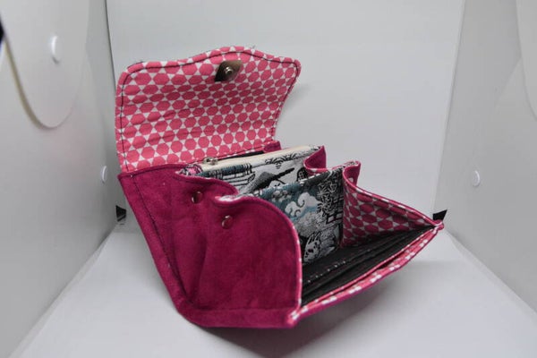 Porte-monnaie en suédine fuchsia et tissu jacquard manga. Doublure en coton upcyclé, il possède une poche zippée en tissu jacquard, doublée coton, plusieurs emplacements pour les cartes (possibilité de ranger 8 cartes). Il se ferme grâce à un fermoir aimant. Modèle unique.