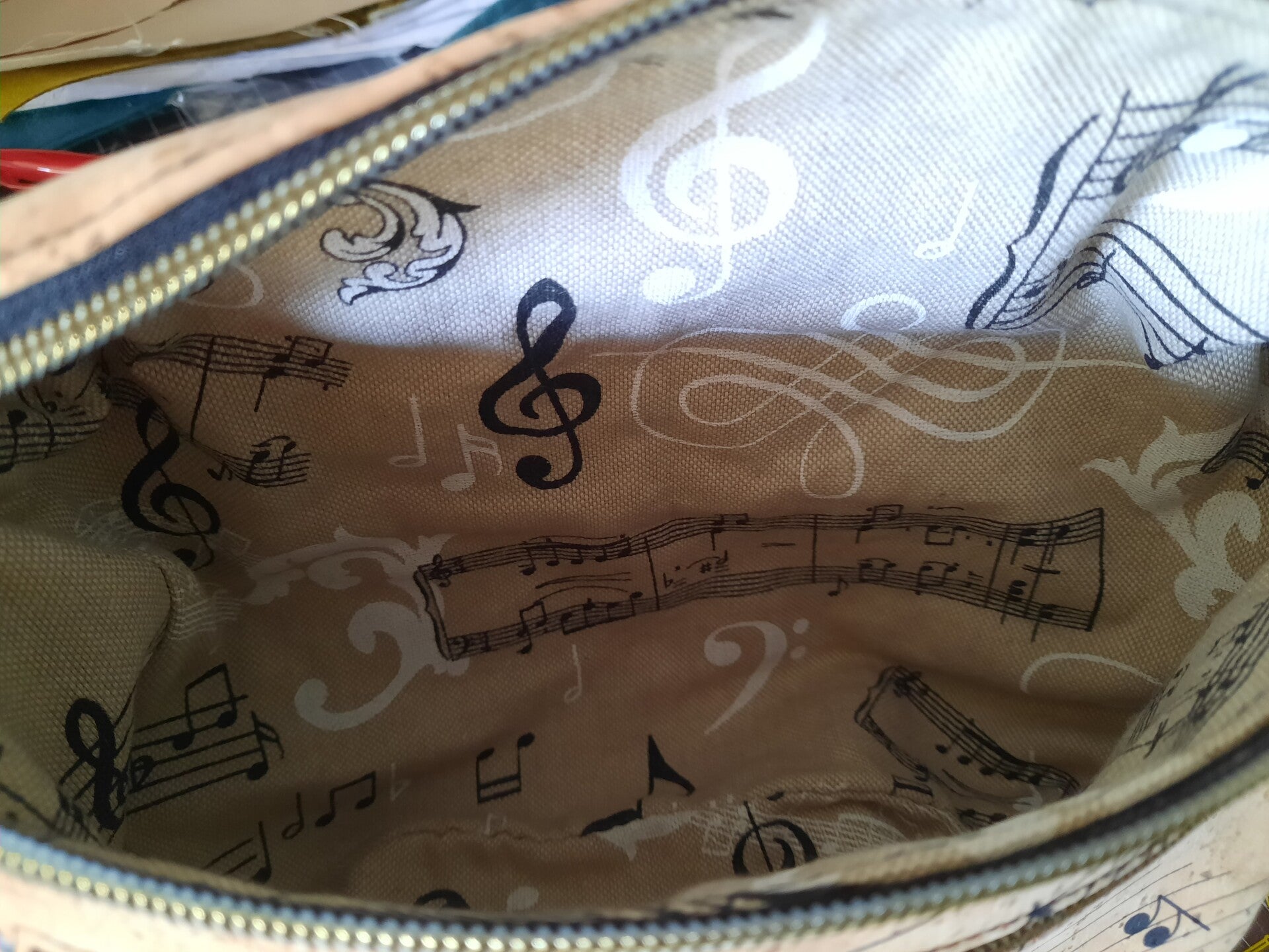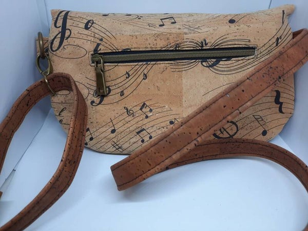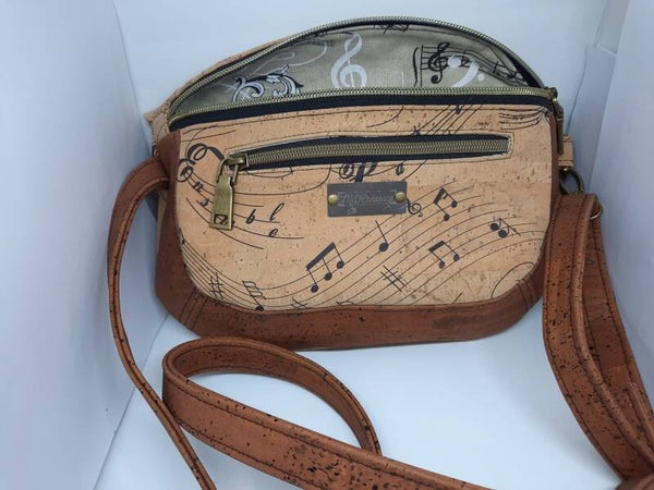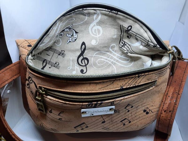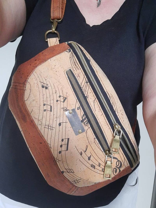 Sac banane en liège symphonie, liège en édition limité et liège marron. Intérieur mélange coton/lin imprimé notes de musique.