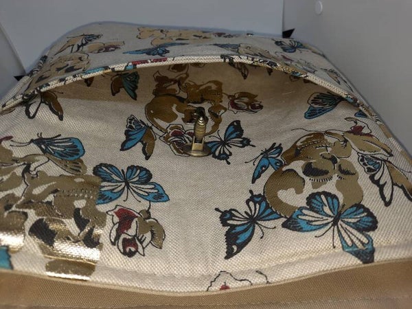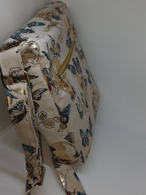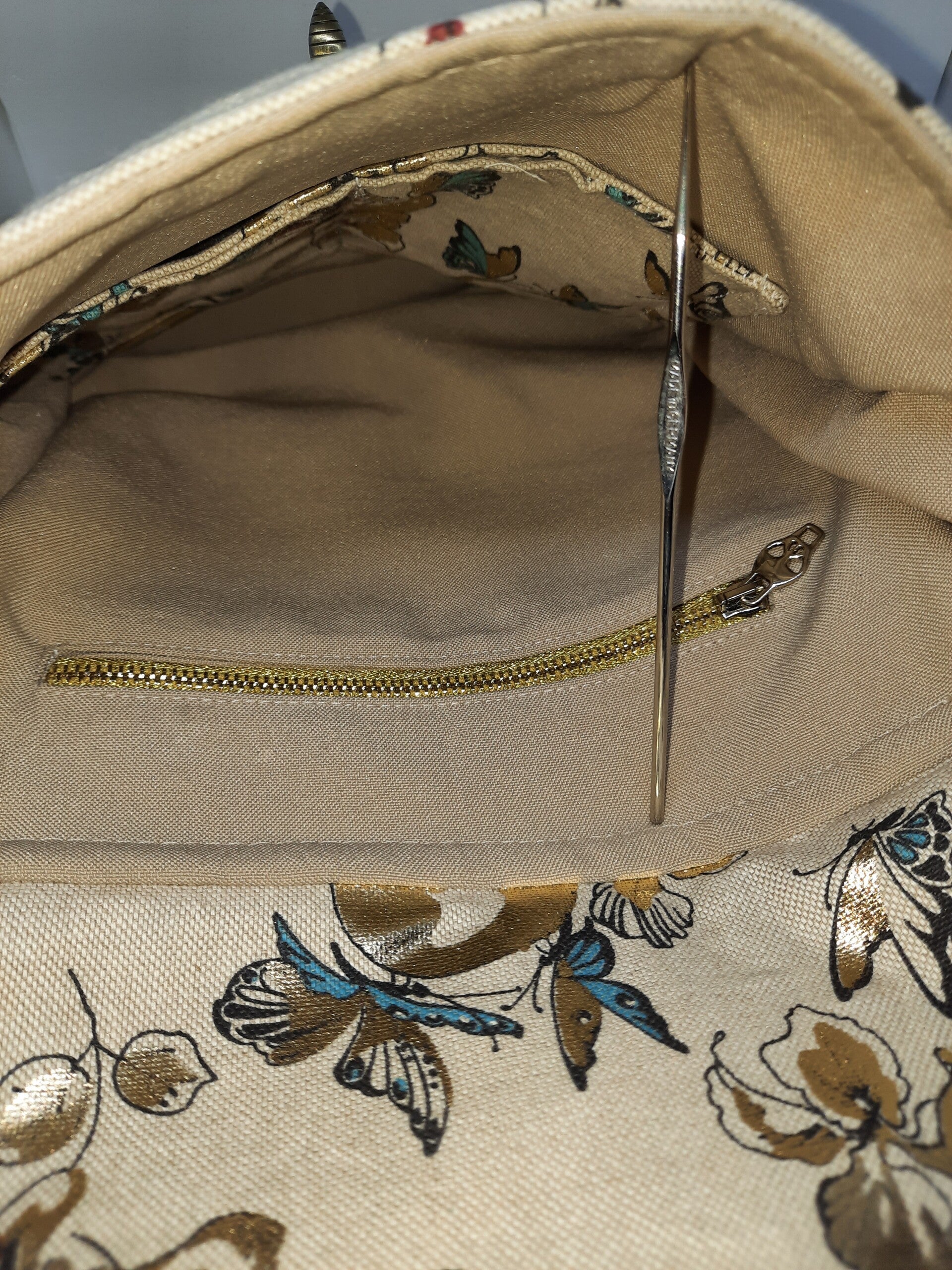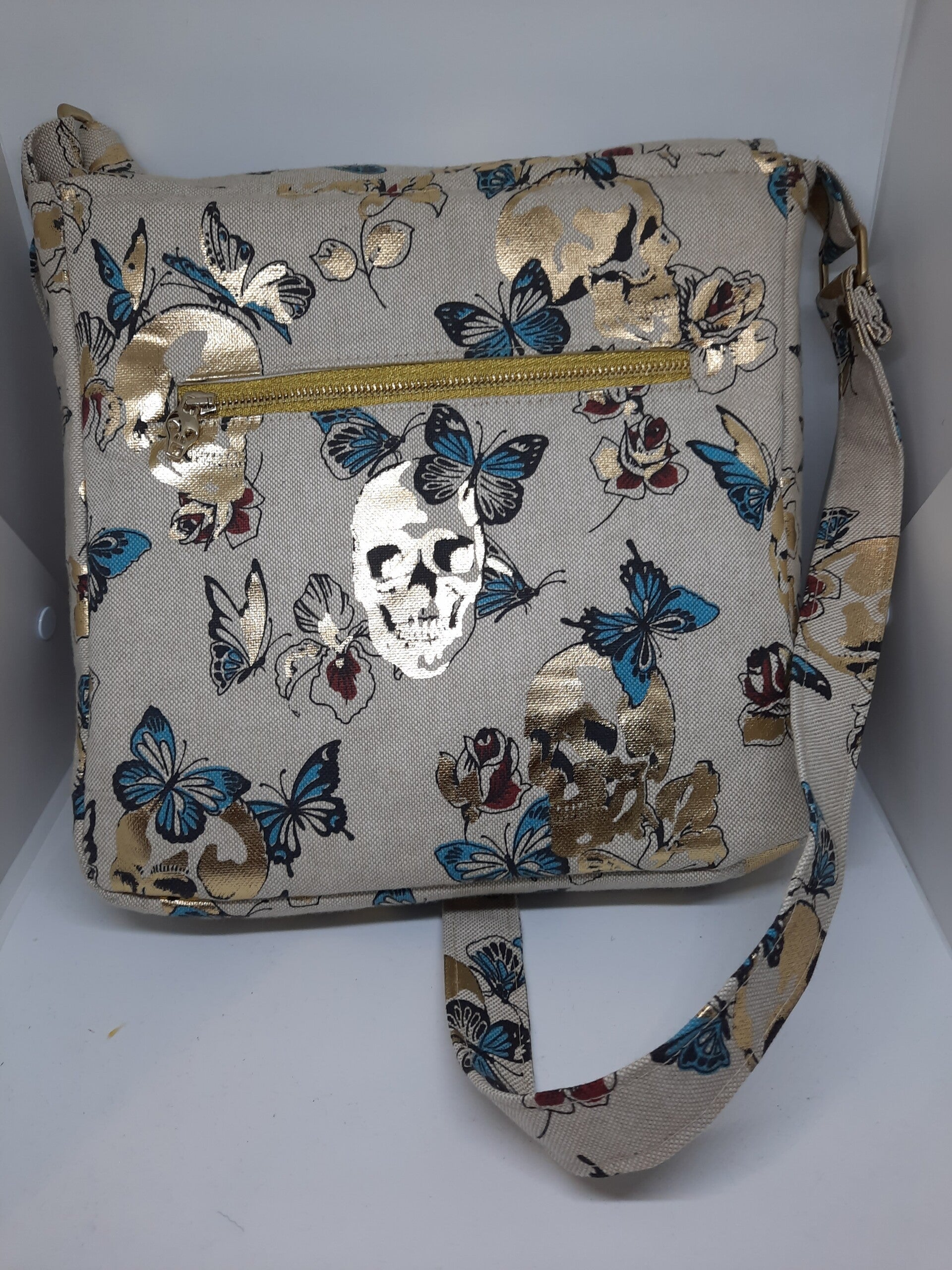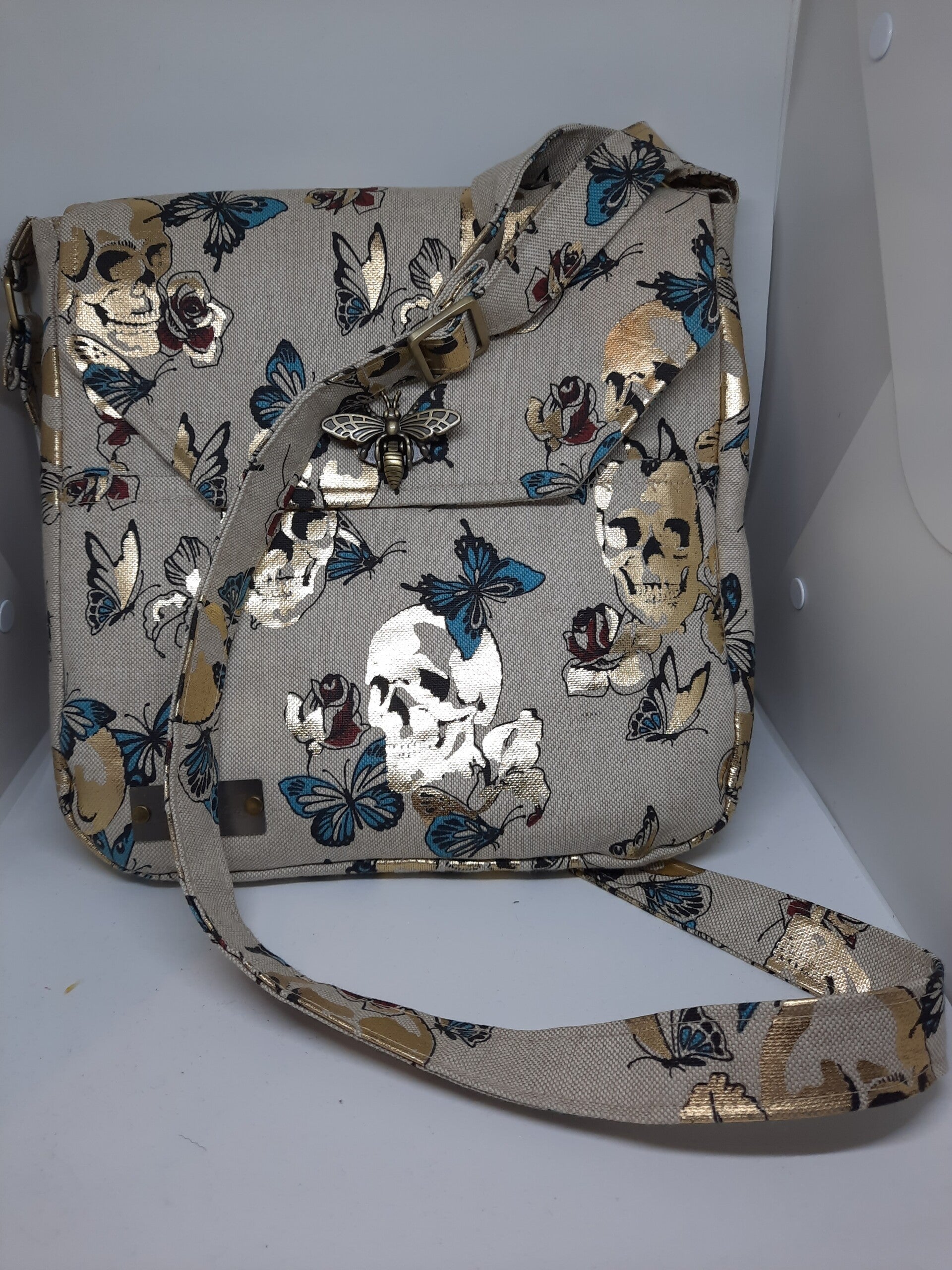 Sacoche en lin motifs tête de mort, multi poches. Une poche plaquée devant fermée par un aimant, une poche zippée avec fermeture éclair dorée, curseur tête de mort. Intérieur en coton beige uni, 2 poches, une plaquée en tissu tête de mort et une avec un zip doré, curseur tête de mort. Le rabat se ferme grace à une fermeture en forme d'abeille.