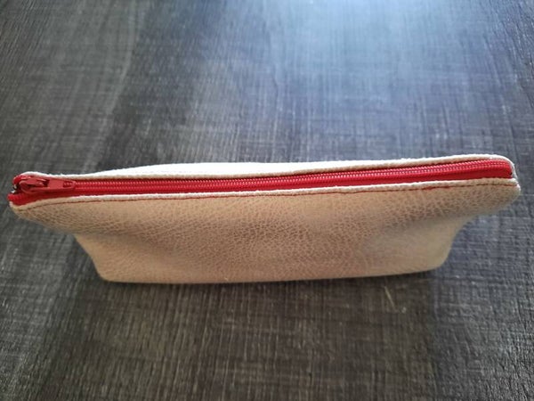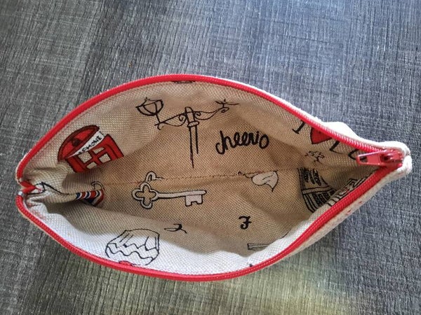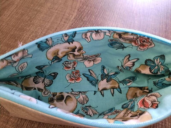 Trousse en simili argenté, fond simili bleu. Fermeture éclair bleue. Intérieur en coton impression têtes de mort grises, fleurs roses et blanches et papillons blancs et bleus sur fond bleu ciel. Entièrement fait à la main.