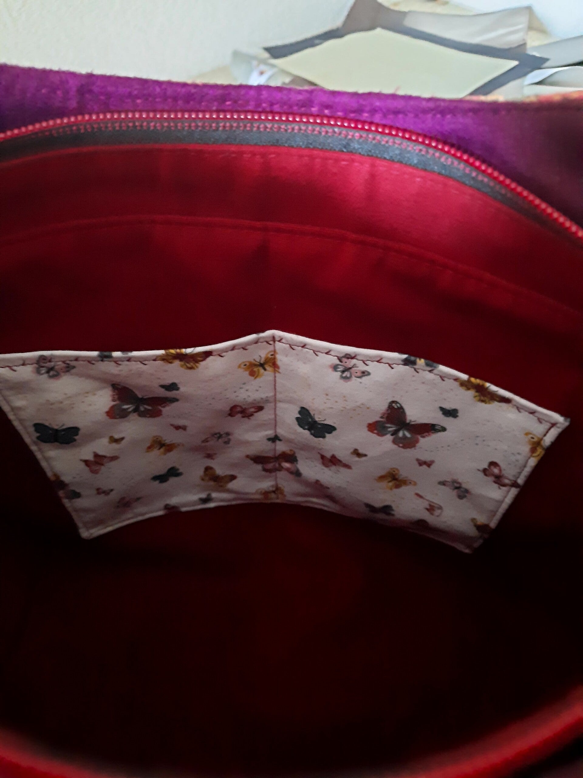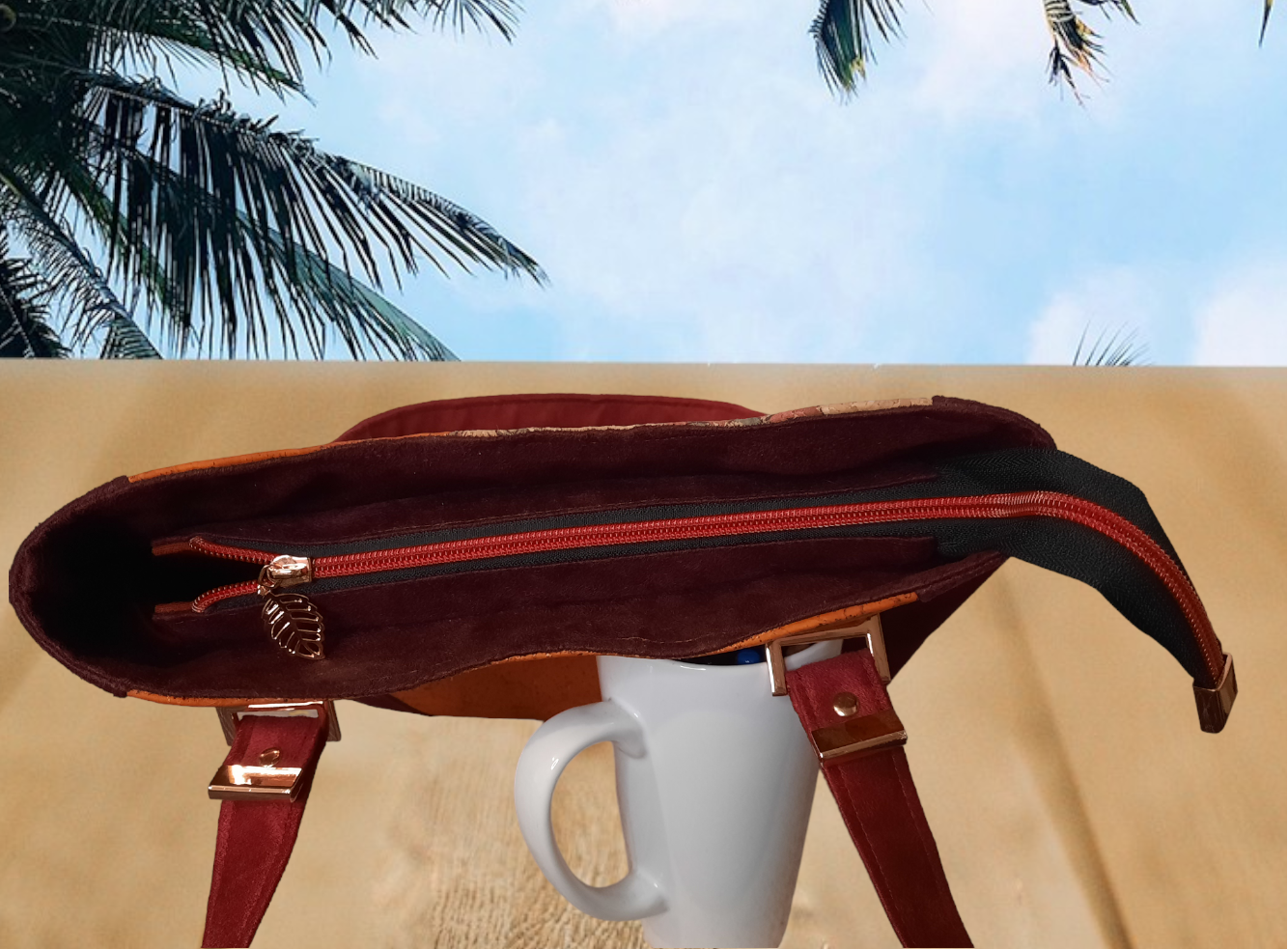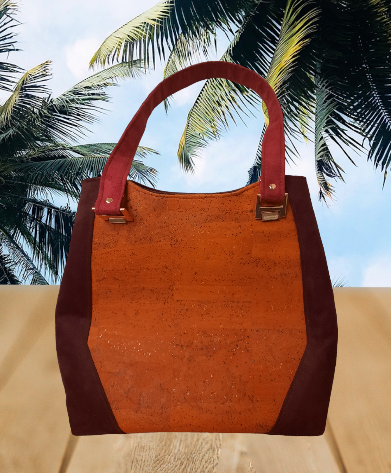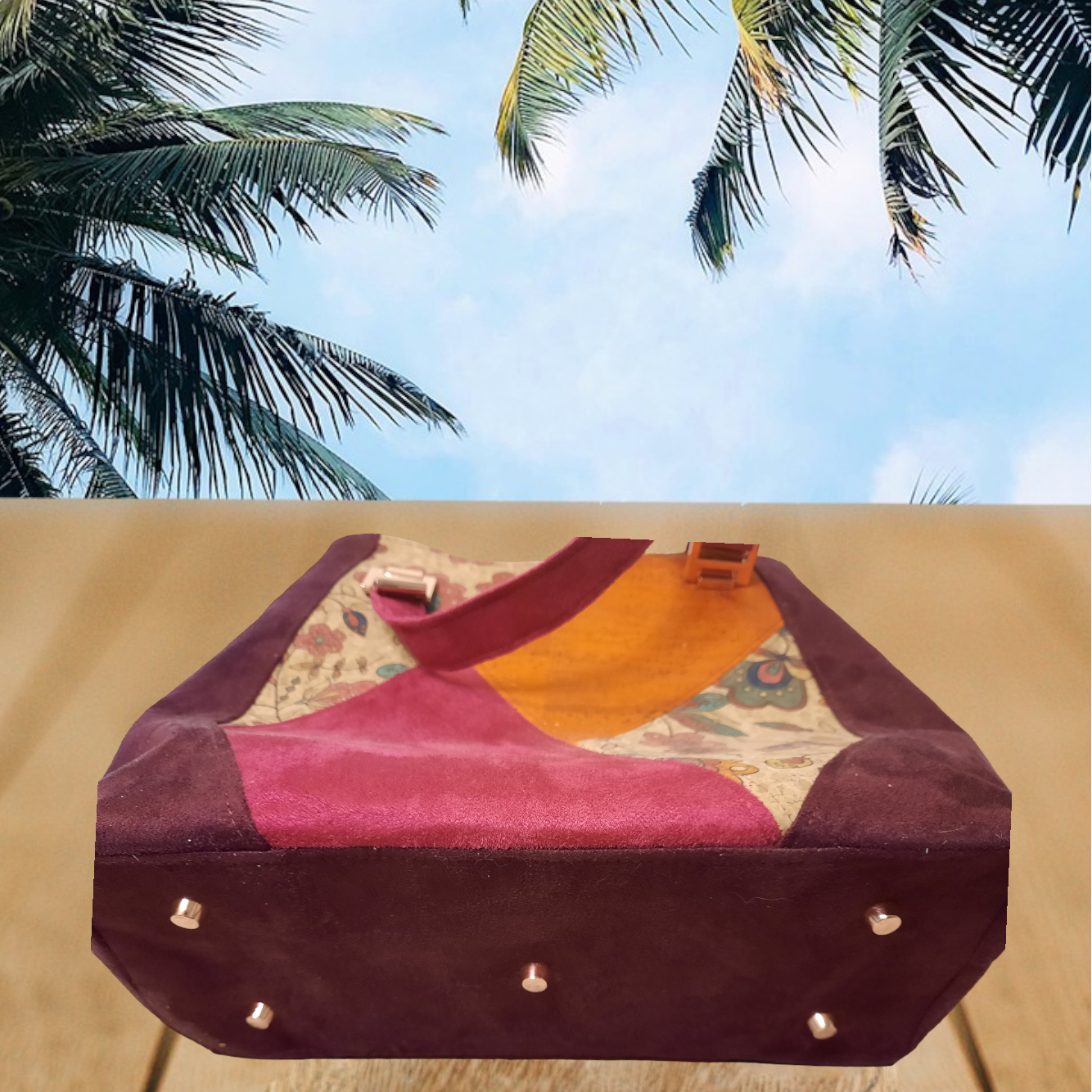 Sac avec anses Rosario en liège et suédine, interieur coton. Une poche plaquée motifs papillons et une poche zippée à l'intérieur. Bouclerie couleur or rose. Patron Shambalabag
