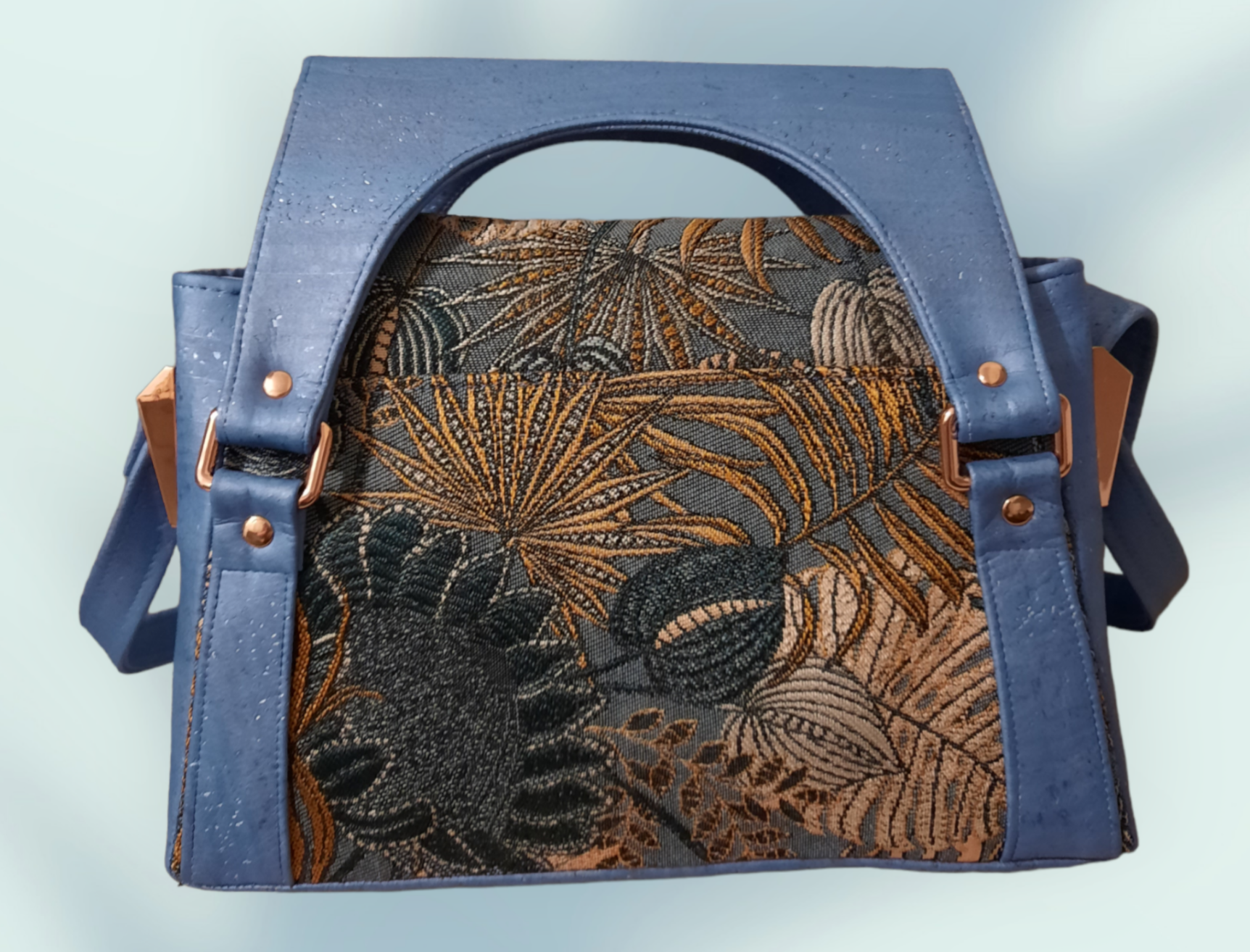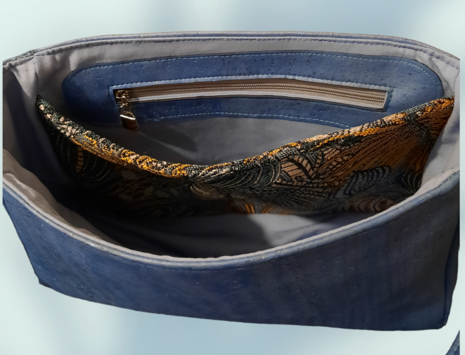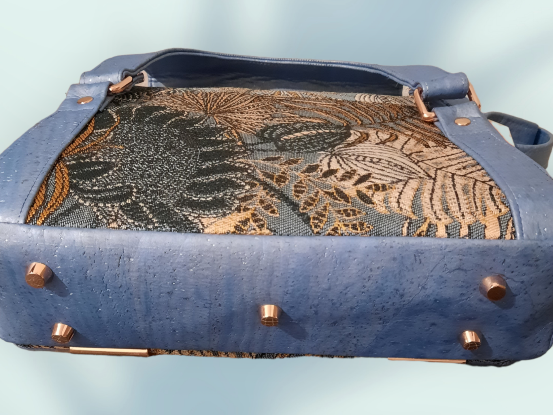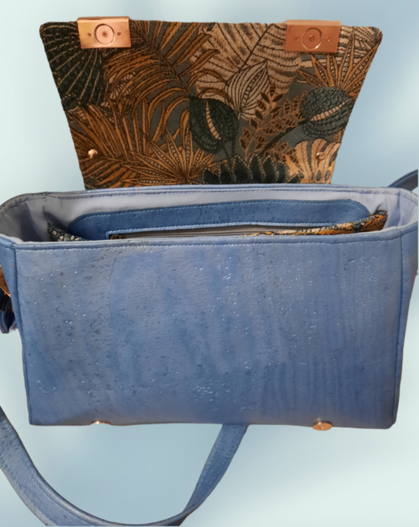 Alyssia en tissu d'ameublement et liège, intérieur cotonnade bleue avec une poche zippée et une poche plaquée. Bouclerie couleur rose or. Patron Rlrcreations.