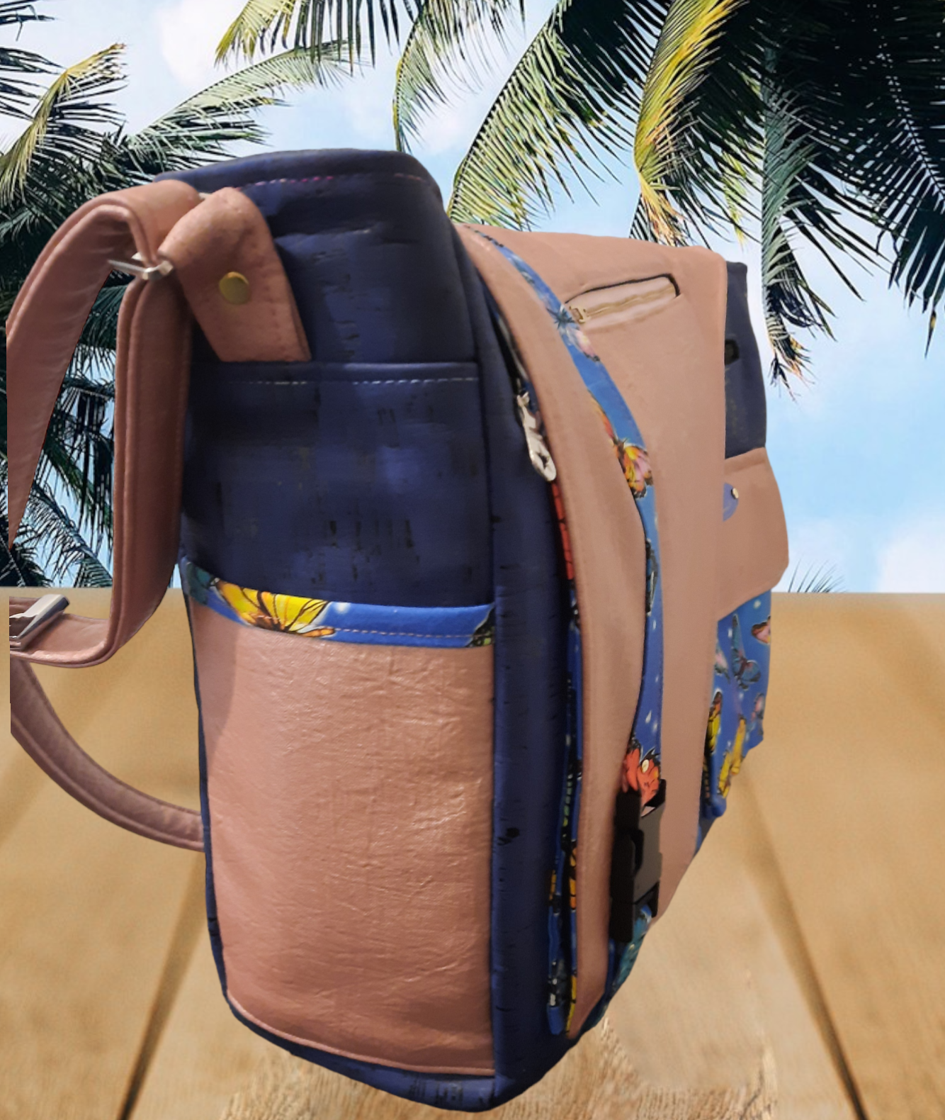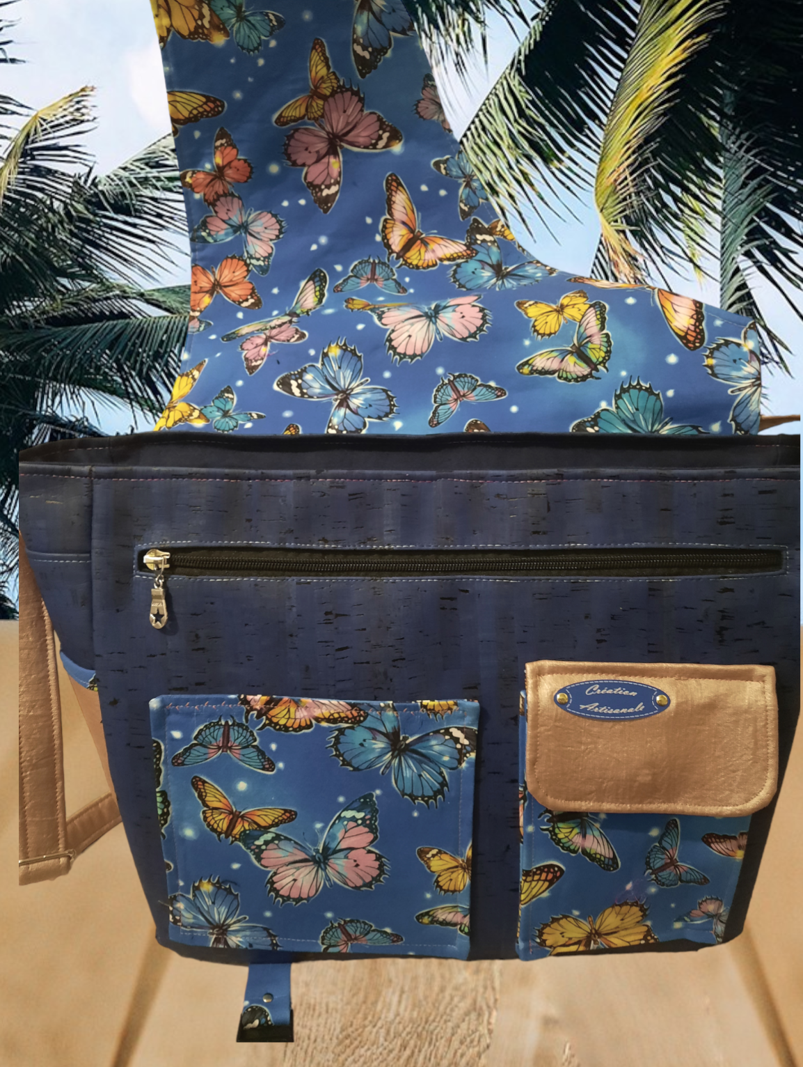 Sac Urban messenger, grande capacité, en liège bleu jean et simili rose, poches coton imprimé papillons, possibilité d'y mettre un ordinateur portable, des classeurs et cahiers de grande taille. 8 poches, une poche rabat sur l'avant, une poche zippée sur le rabat, une poche zippée sur le devant, une autre poche zippée à l'arrière. Intérieur coton avec deux poches plaquées dont une avec un élastique.