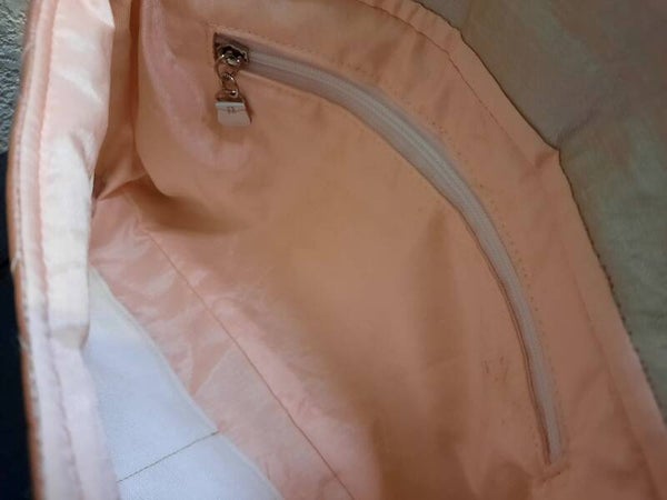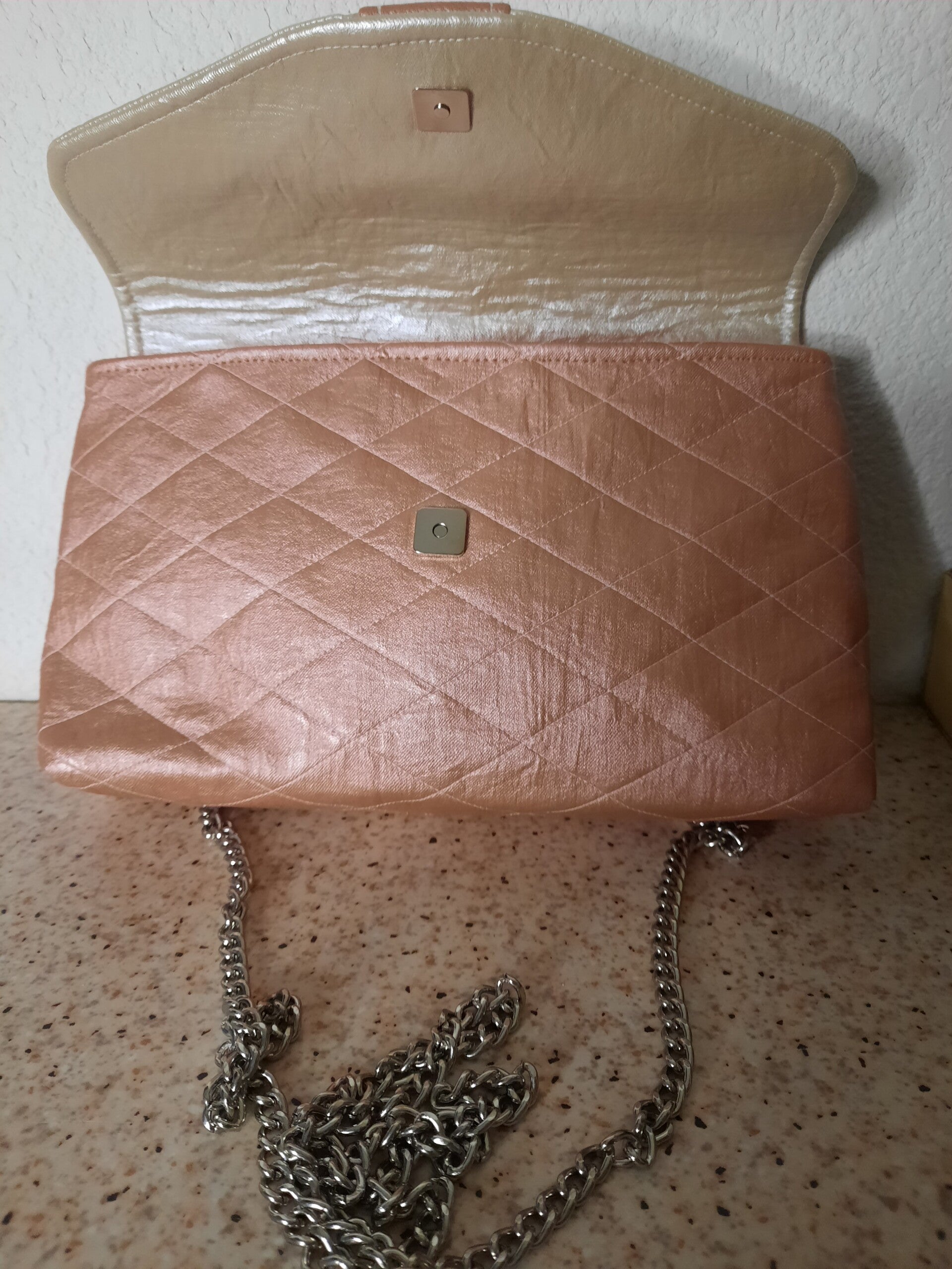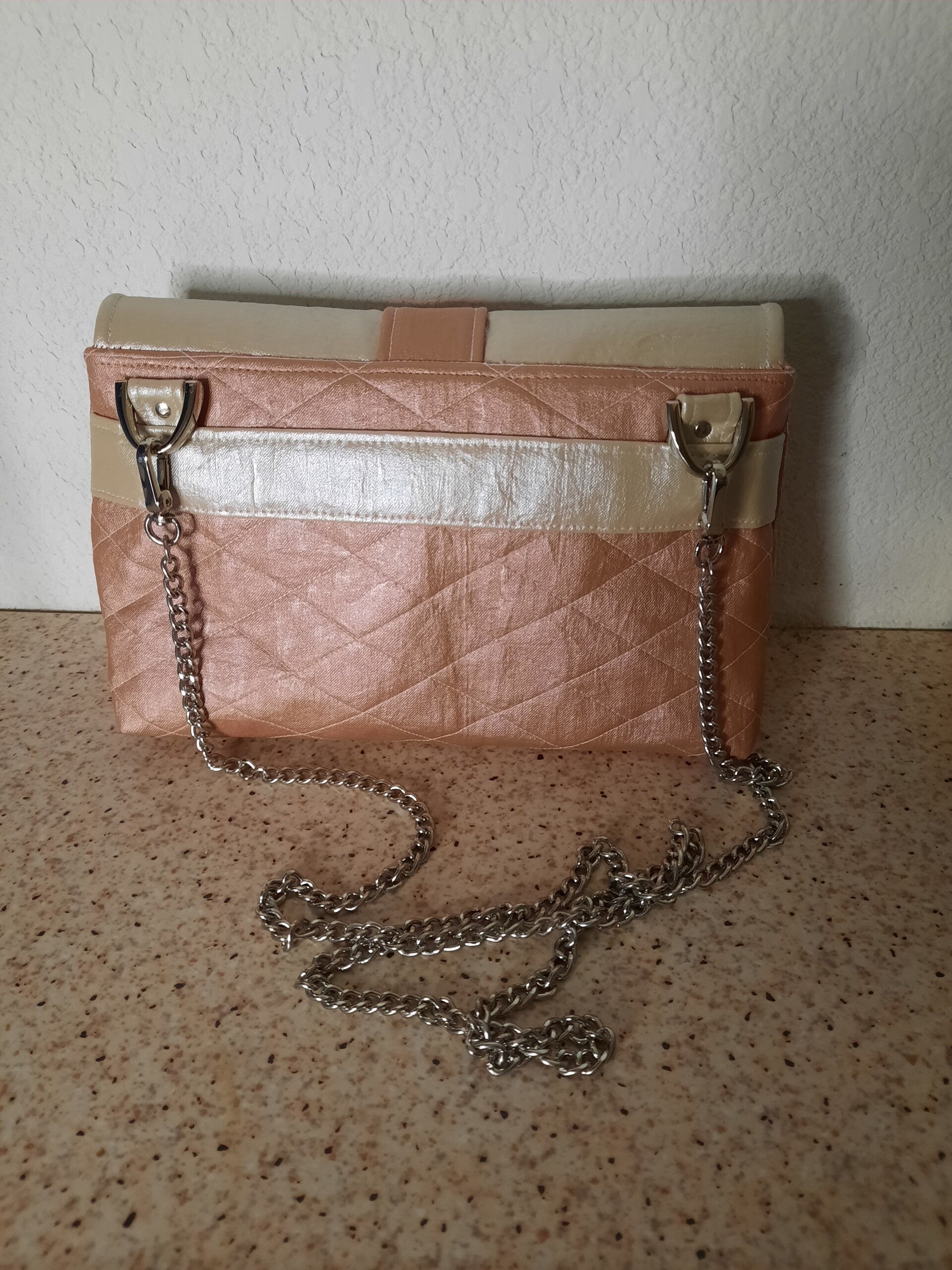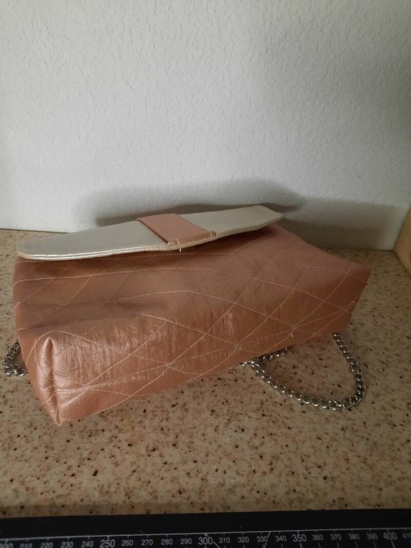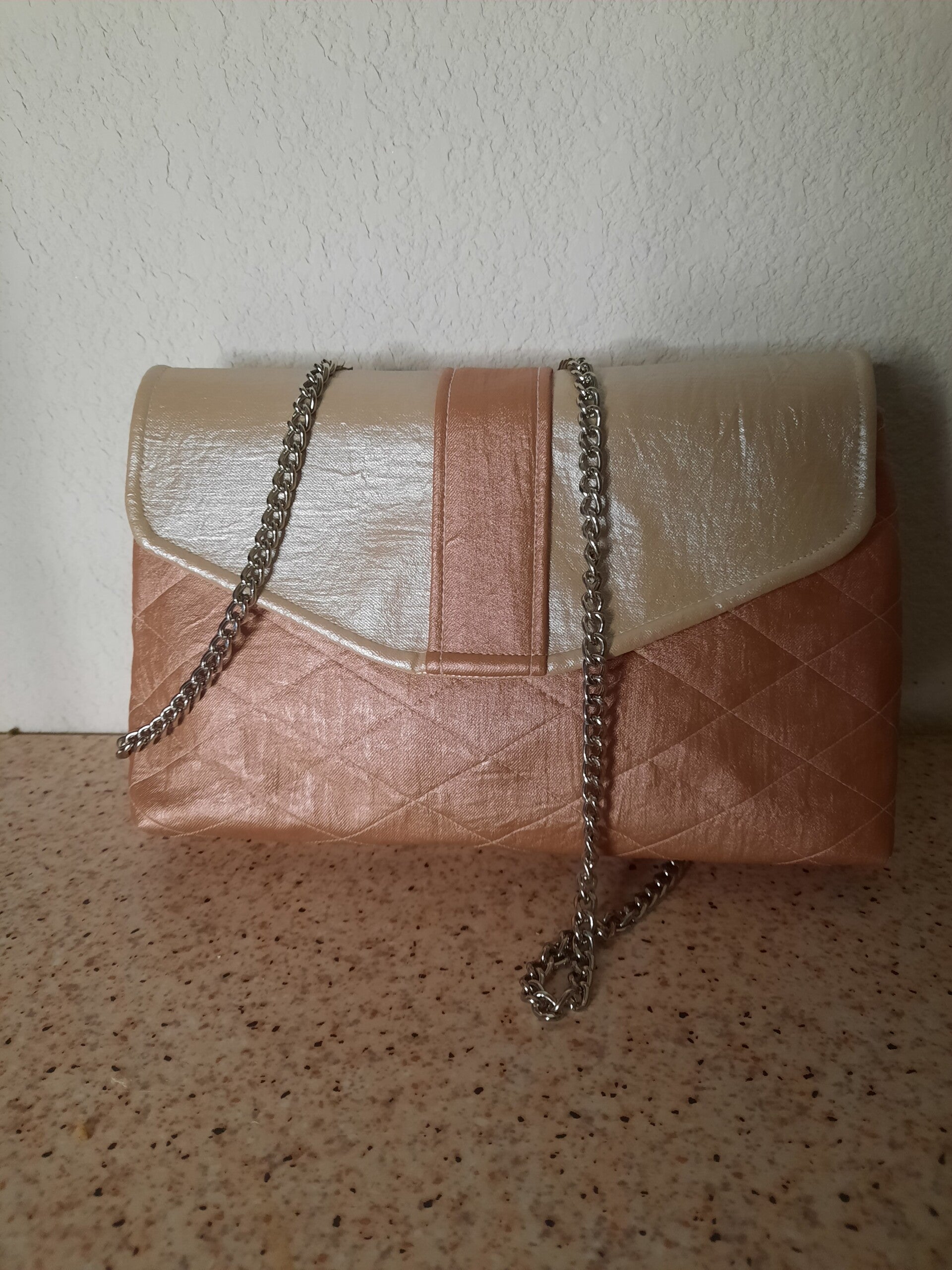 Mini sac en simili vieux rose et beige doré matelassé. Très class, intérieur en polyesther, petite poche plaquée coton brodé petite fleur et poche fermeture éclair blanche, curseur forme de sac à main. Le sac est fermé par un bouton aimanté. Anse chainette amovible de 120 cm. Finitions soignées.
