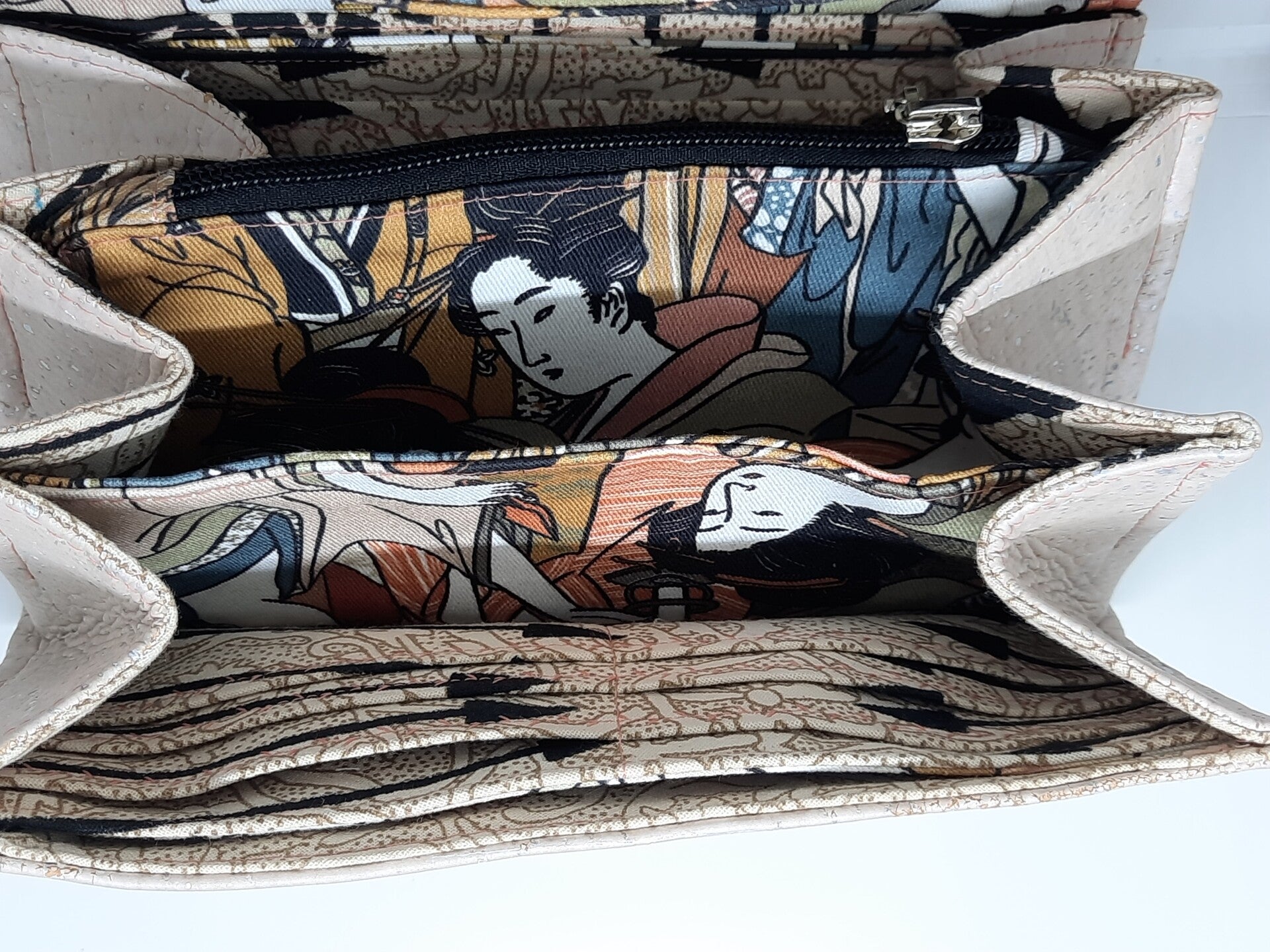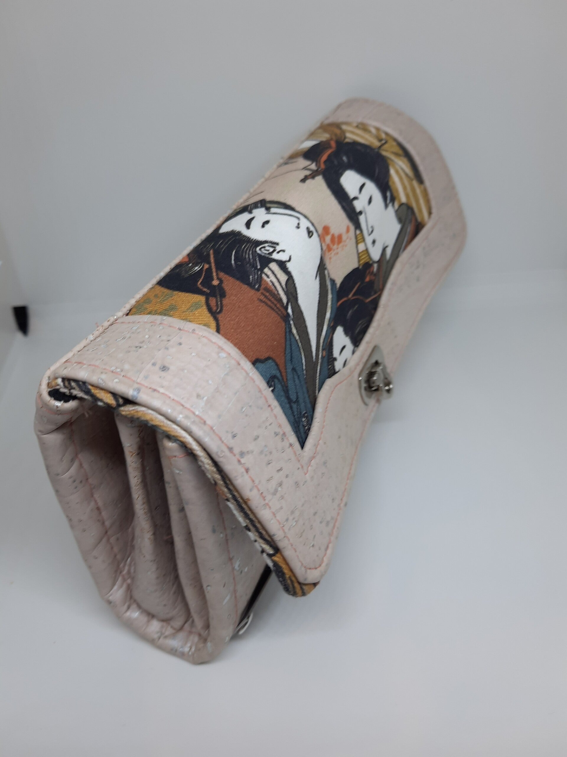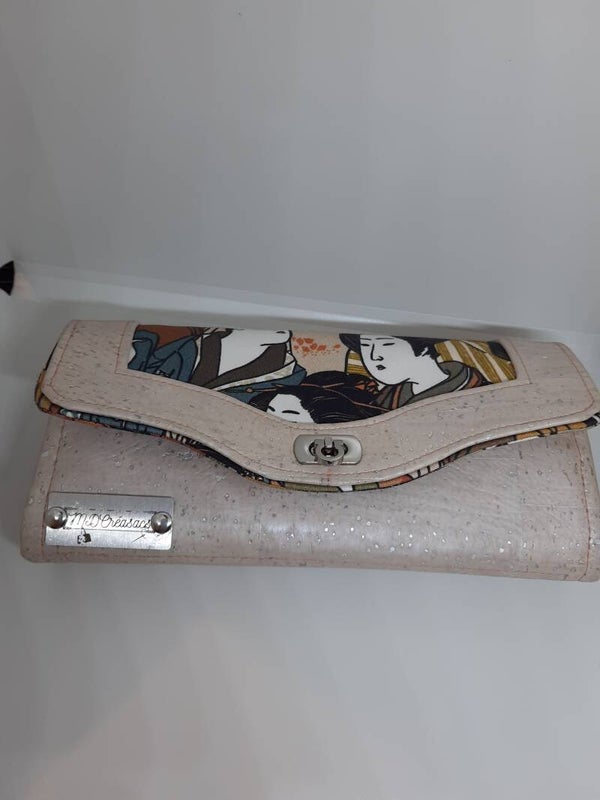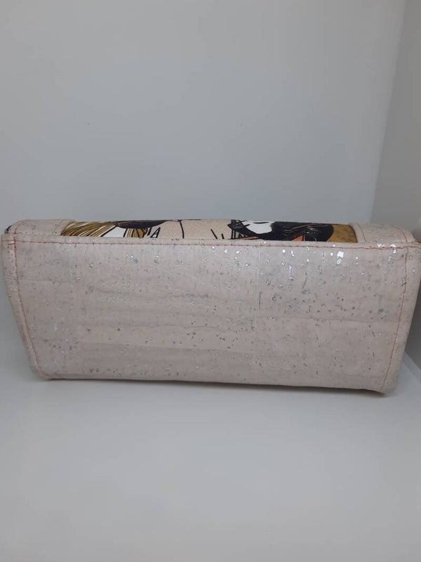 Ce portefeuille est en liège et coton imprimé, il possède un fermoir en métal.